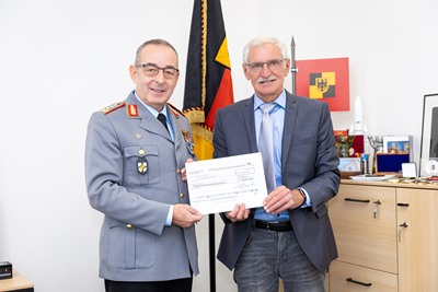 Die Terminfindung war sicherlich die größte Herausforderung für unseren Stellvertreter. Verständlich bei dem umfangreichen Terminplan des ranghöchsten Soldaten der Bundeswehr und Berater des Kanzlers in allen militärischen Angelegenheiten. Am 1. Oktober war es dann soweit und Oberst a.D. Kolb war wieder in „seinem“ Verteidigungsministerium, in dem er über 12 Jahre seiner Dienstzeit „beschäftigt“ war. Mit General Carsten Breuer besuchte er den Nachfolger unseres letzten Schirmherrn der Stiftung, was natürlich Einfluss auf den Gesprächsverlauf hatte. Nach der Begrüßung und der offiziellen Scheckübergabe mit Foto hatte Oberst a.D. Kolb die Gelegenheit, die Stiftung mit Ihren Aufgaben und Gremien ausführlich darzustellen. General Breuer bedankte sich für Ausführungen und die großzügige Spende. Er appellierte an die Verantwortlichen, auch einmal an der Spenderehrung mit einem Vertreter teilzunehmen und bedankte sich ausdrücklich für die ehrenamtliche Tätigkeit der pensionierten Stabsoffiziere im Beirat. Die Einladung zur Übernahme der Schirmherrschaft für die Stiftung hat er den Worten unseres Stellvertreters wohl entnommen, bat aber angesichts der derzeitigen Aufgabenvielfalt um noch etwas Bedenkzeit. Mit der Zusage, die nächsten Spendenübergabe im Zusammenhang mit der Ehrung der Spender und Spenderinnen in Berlin zu verbinden und der wohlwollenden Prüfung unserer „Herzensangelegenheit“ General Breuer als Schirmherrschaft der Stiftung zu gewinnen, beendeten die Gesprächspartner den Termin. (HK)